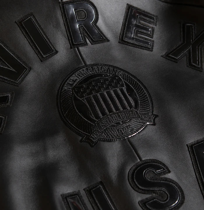 This authentic military-style bomber jacket, crafted from premium 100% European antique lambskin, will elevate your outerwear collection. The front zipper features signature hardware, and the collar, back, and chest are adorned with a distinctive brand logo, perfectly blending traditional craftsmanship with timeless style. The striped ribbed hem, cuffs, and single patch pocket offer both comfort and practicality. An essential bespoke piece for those who appreciate genuine leather quality and classic aviation aesthetics.